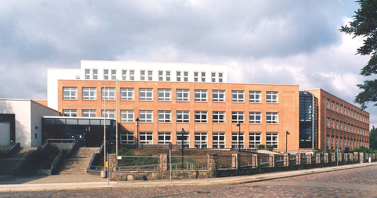 Ein durch Kriegsschäden frei gewordenes Gelände, etwa 5m über dem Straßenniveau, wurde mit einem dreizügigen Gymnasium für 880 Schüler und 55 Lehrer bebaut. Entstanden ist ein abgewinkelter, mehrfach gegliederter und in der Höhe gestaffelter Baukörper. Die Mehrzahl der Klassen befindet sich im mittleren Baukörper, der zweihüftig ausgebildet wurde. Zwei zweigeschossige, über Gäasgänge erreichbare Seitenflügel nehmen die Schulverwaltung, kurs- und Fachräume Kunst und Musik auf. Ein viertes Geschoss für die Fachräume der Informatik betont den Eingang, neben dem die Aula angeordnet ist. Der Eingangsbereich mit Aula, Foyer und Cafeteria kann von der Schule bei öffentlicher Nutzung abgetrennt werden.